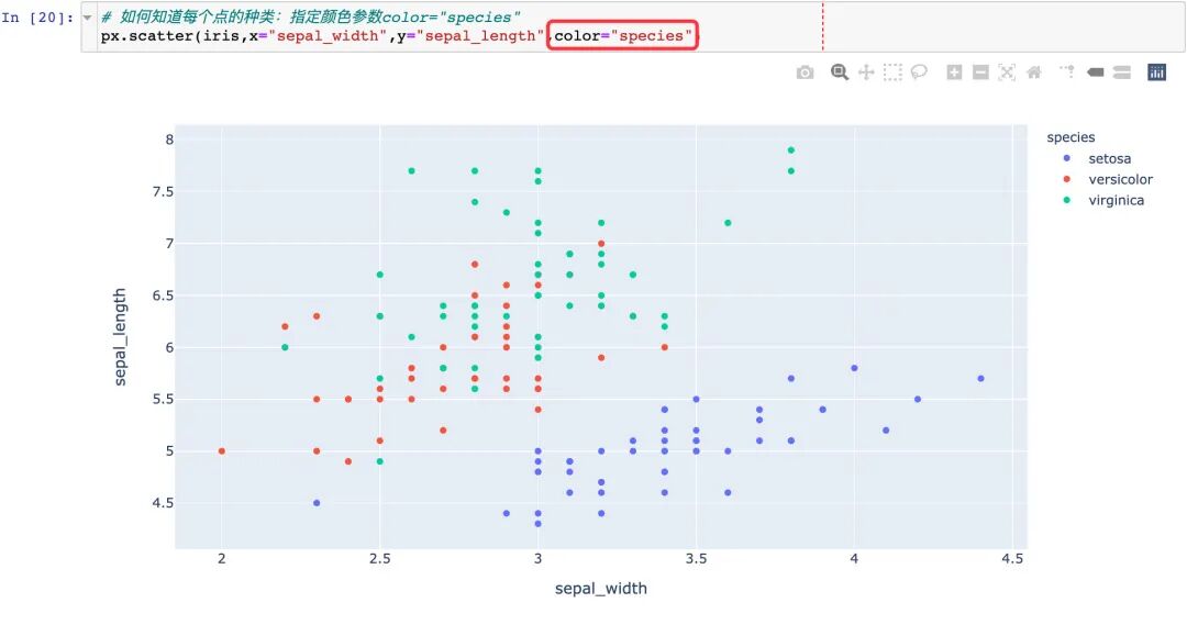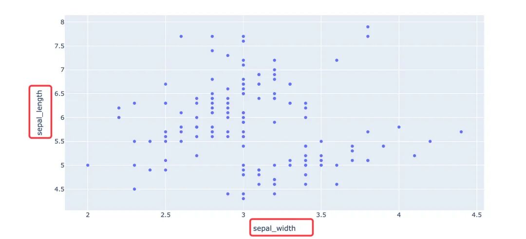 选择两个属性作为横纵坐标来绘制散点图fig = px.scatter( iris, # 数据集 x="sepal_width", # 横坐标 y="sepal_length" # 纵坐标 ) fig.show()