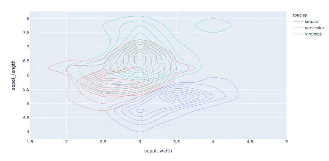 等高线图反映数据的密度情况:px.density_contour( iris, # 绘图数据集 x="sepal_width", # 横坐标 y="sepal_length", # 纵坐标值 color="species" # 颜色 )