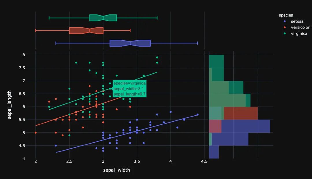 px.scatter( iris, # 数据集 x="sepal_width", # 横坐标值 y="sepal_length", # 纵坐标取值 color="species", # 颜色 marginal_x="box", # 横坐标为箱型图 marginal_y="histogram", # 纵坐标为直方图 height=600, # 高度 trendline="ols", # 显示趋势线 template="plotly_dark") # 主题