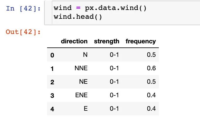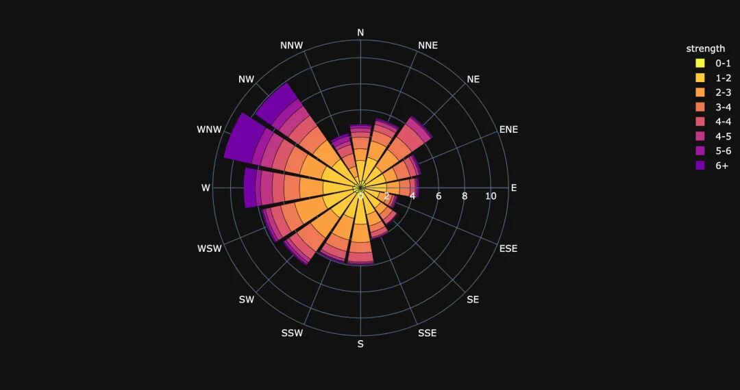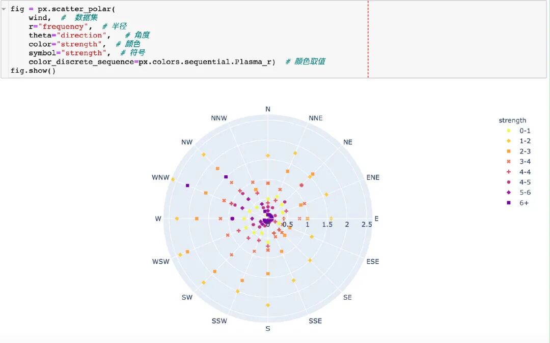fig = px.bar_polar( wind, # 数据集 r="frequency", # 半径 theta="direction", # 角度 color="strength", # 颜色 template="plotly_dark", # 主题 color_discrete_sequence=px.colors.sequential.Plasma_r) # 颜色变化 fig.show()