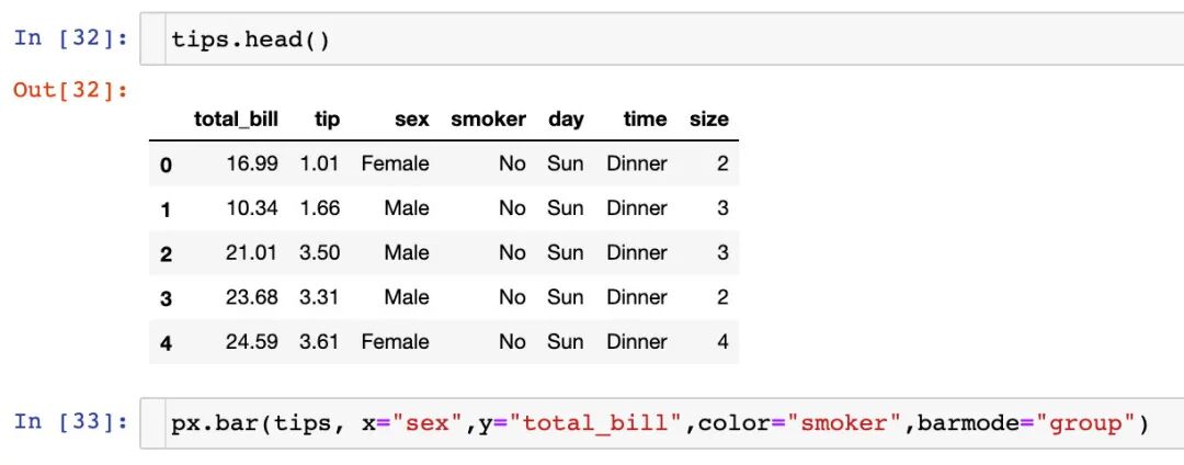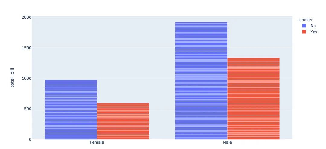 fig = px.bar( tips, # 数据集 x="sex", # 横轴 y="total_bill", # 纵轴 color="smoker", # 颜色参数取值 barmode="group", # 柱状图模式取值 facet_row="time", # 行取值 facet_col="day", # 列元素取值 category_orders={ "day": ["Thur","Fri","Sat","Sun"], # 分类顺序 "time":["Lunch", "Dinner"]}) fig.show()