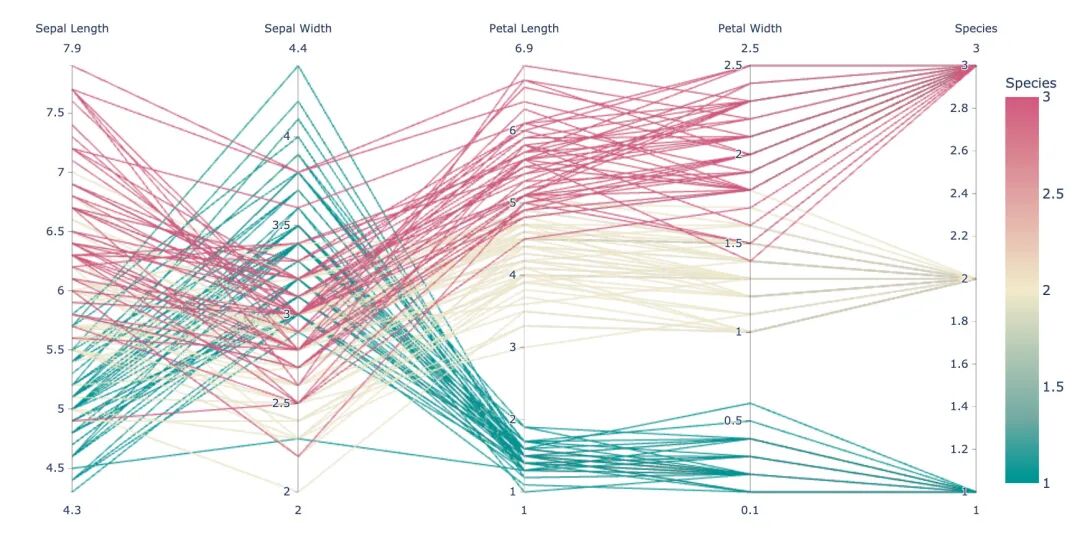 px.parallel_coordinates( iris, # 数据集 color="species_id", # 颜色 labels={"species_id":"Species", # 各种标签值 "sepal_width":"Sepal Width", "sepal_length":"Sepal Length", "petal_length":"Petal Length", "petal_width":"Petal Width"}, color_continuous_scale=px.colors.diverging.Tealrose, color_continuous_midpoint=2)