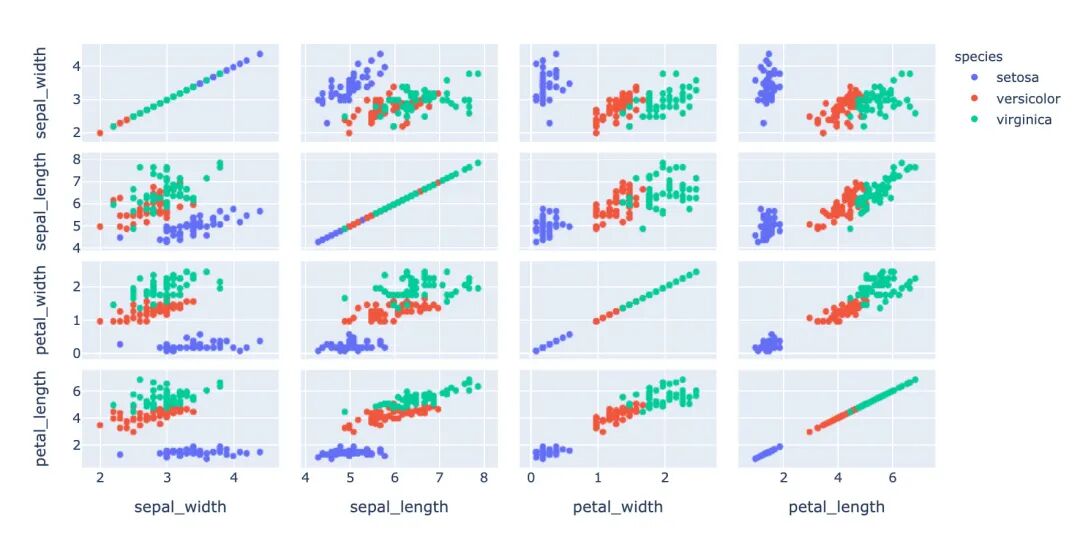 px.scatter_matrix( iris, # 数据 dimensions=["sepal_width","sepal_length","petal_width","petal_length"], # 维度选择 color="species") # 颜色