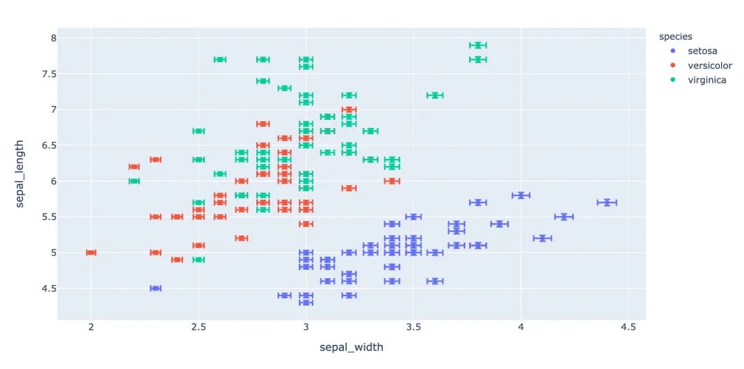 # 对当前值加上下两个误差值 iris["e"] = iris["sepal_width"] / 100 px.scatter( iris, # 绘图数据集 x="sepal_width", # 横坐标 y="sepal_length", # 纵坐标 color="species", # 颜色值 error_x="e", # 横轴误差 error_y="e" # 纵轴误差 )