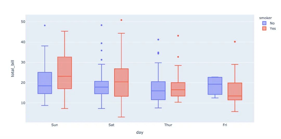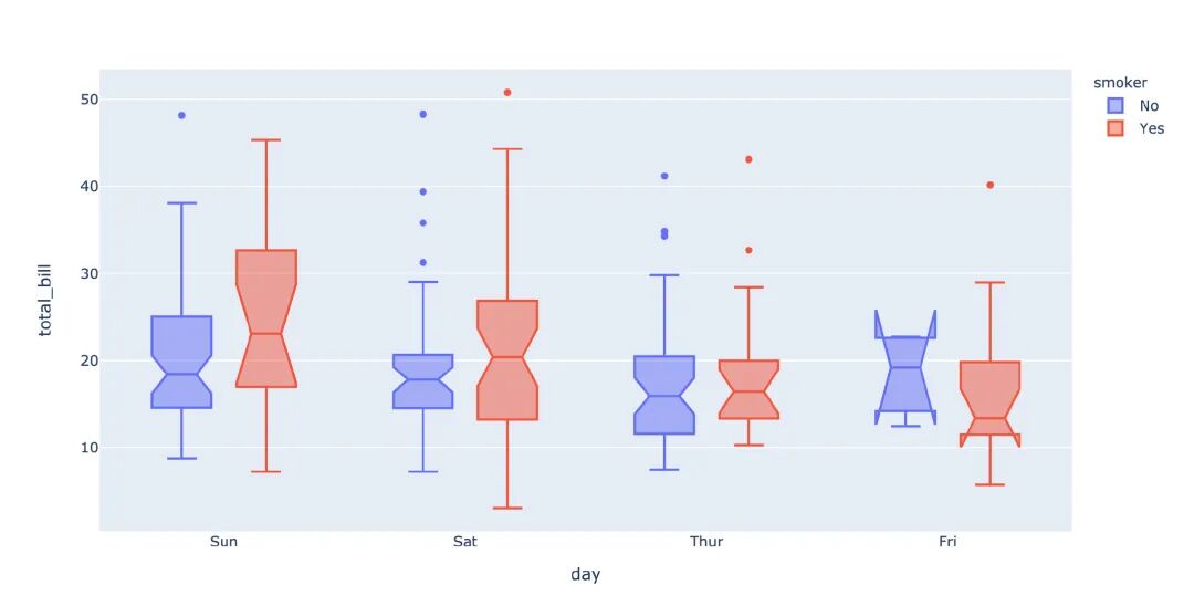 px.box( tips, # 数据集 x="day", # 横轴 y="total_bill", # 纵轴 color="smoker", # 颜色 # notched=True # 隐藏参数 )