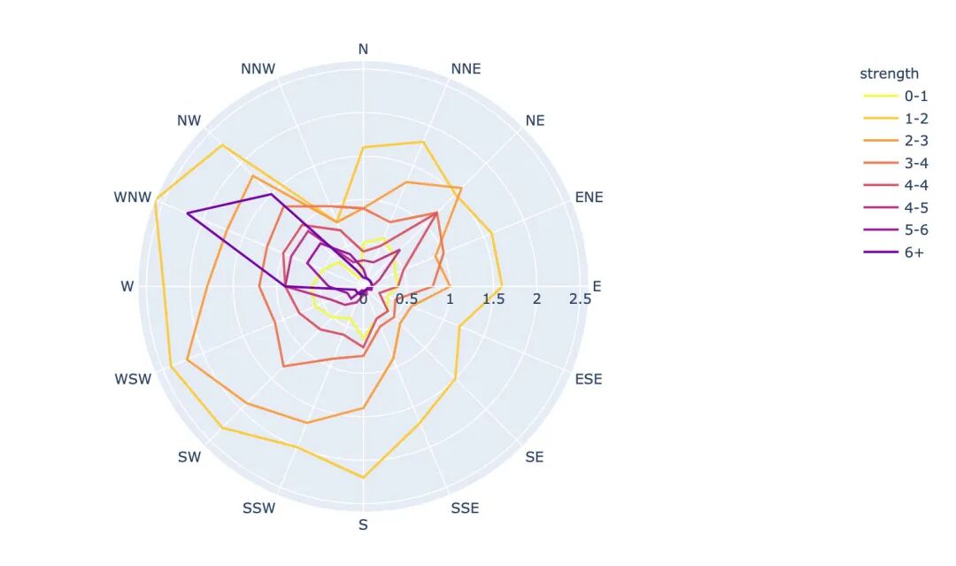 fig = px.line_polar( wind, # 数据集 r="frequency", # 半径 theta="direction", # 角度 color="strength", # 颜色 line_close=True, # 线性闭合 color_discrete_sequence=px.colors.sequential.Plasma_r) # 颜色变化 fig.show()