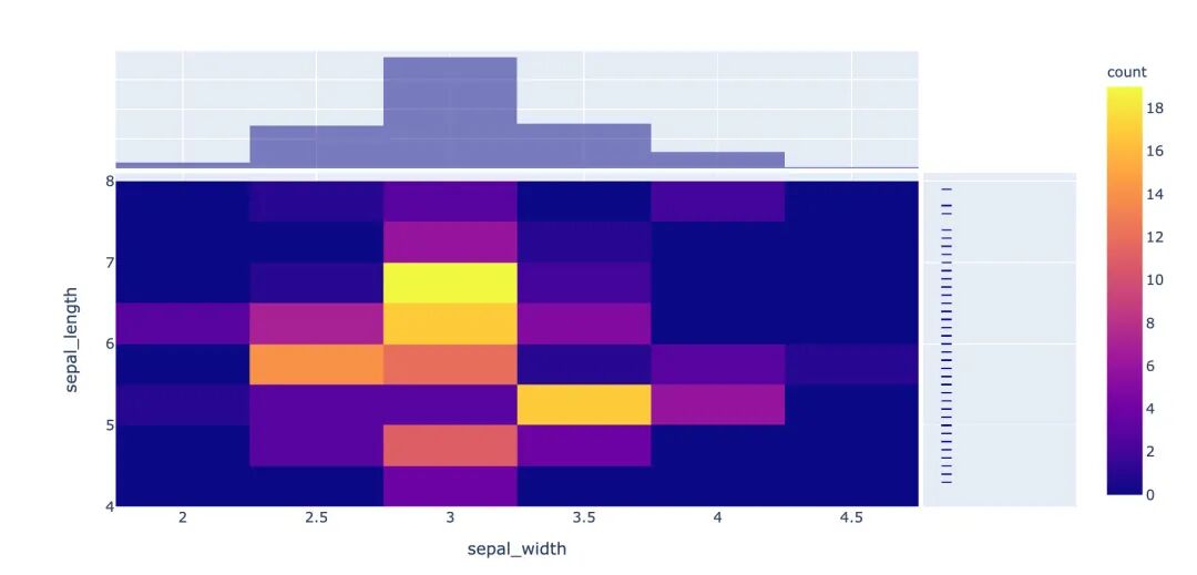 px.density_heatmap( iris, # 数据集 x="sepal_width", # 横坐标值 y="sepal_length", # 纵坐标值 marginal_y="rug", # 纵坐标值为线型图 marginal_x="histogram" # 直方图 )
