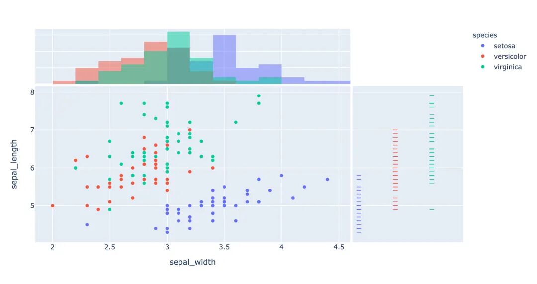 我们一个图形中能够将散点图和直方图组合在一起显示:px.scatter( iris, # 数据集 x="sepal_width", # 横坐标 y="sepal_length", # 纵坐标 color="species", # 颜色 marginal_x="histogram", # 横坐标直方图 marginal_y="rug" # 细条图 )