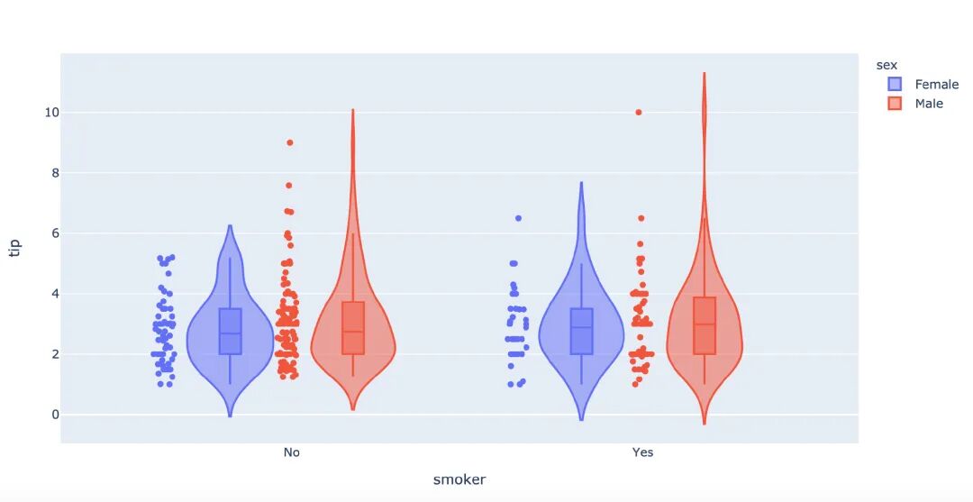 px.violin( tips, # 数据集 x="smoker", # 横轴坐标 y="tip", # 纵轴坐标 color="sex", # 颜色参数取值 box=True, # box是显示内部的箱体 points="all", # 同时显示数值点 hover_data=tips.columns) # 结果中显示全部数据