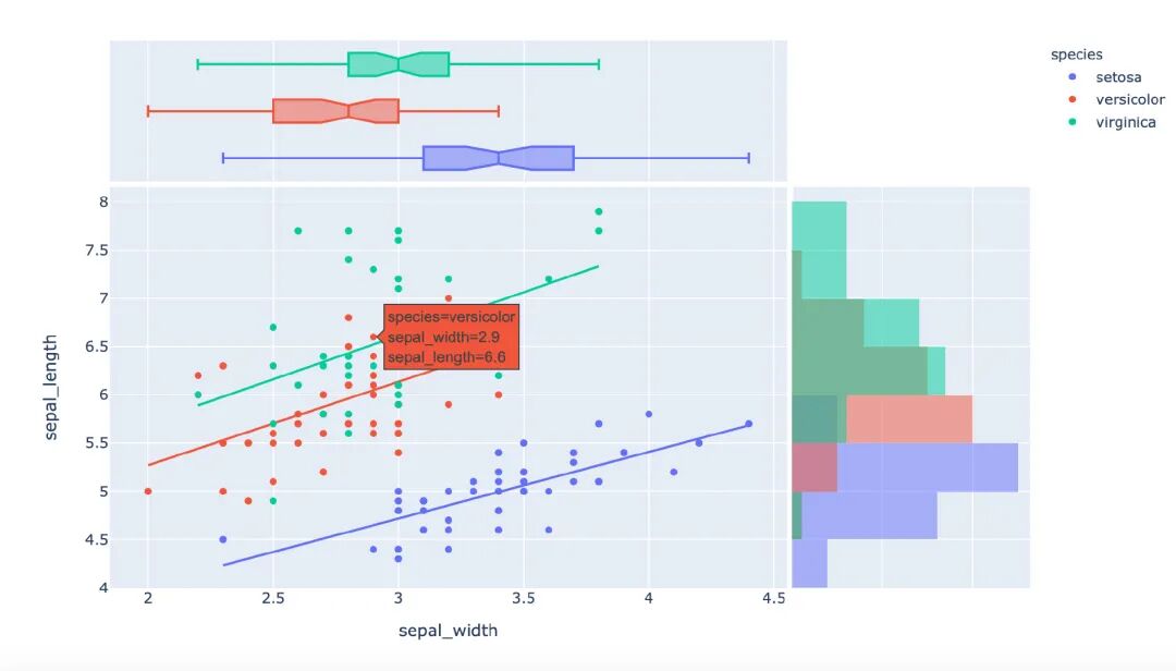 px.scatter( iris, # 数据集 x="sepal_width", # 横坐标值 y="sepal_length", # 纵坐标取值 color="species", # 颜色 marginal_x="box", # 横坐标为箱型图 marginal_y="histogram", # 纵坐标为直方图 height=600, # 高度 trendline="ols", # 显示趋势线 template="plotly_white") # 主题