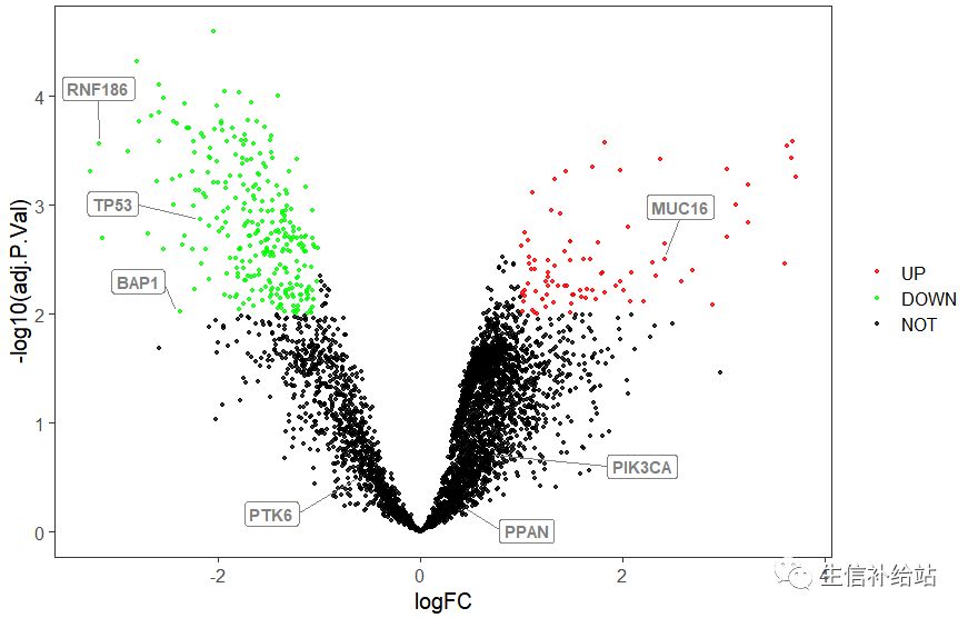 基本和纸一致,但是因为差异表达基因太多,存在重叠情况,现使用ř语言的ggrepel包解决标签太多导致的重叠问题。