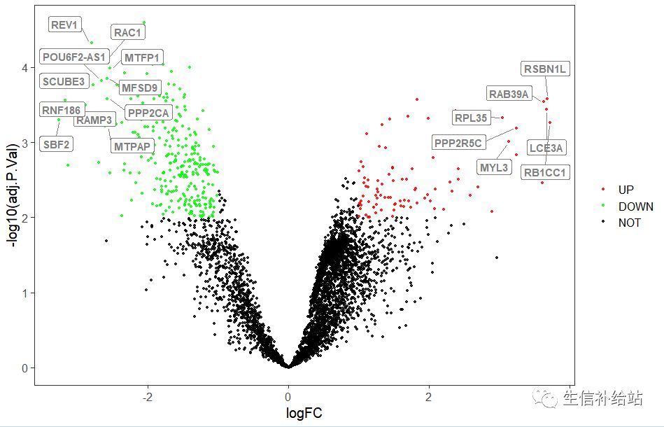 library(ggrepel)ggplot(data = data, aes(x = logFC, y = -log10(adj.P.Val), color = change)) +geom_point(alpha=0.8, size = 1) +theme_bw(base_size = 15) +theme(panel.grid.minor = element_blank(),panel.grid.major = element_blank()) +scale_color_manual(name = "", values = c("red", "green", "black"), limits = c("UP", "DOWN", "NOT")) +geom_label_repel(aes(label=sign), fontface="bold", color="grey50", box.padding=unit(0.35, "lines"), point.padding=unit(0.5, "lines"), segment.colour = "grey50")