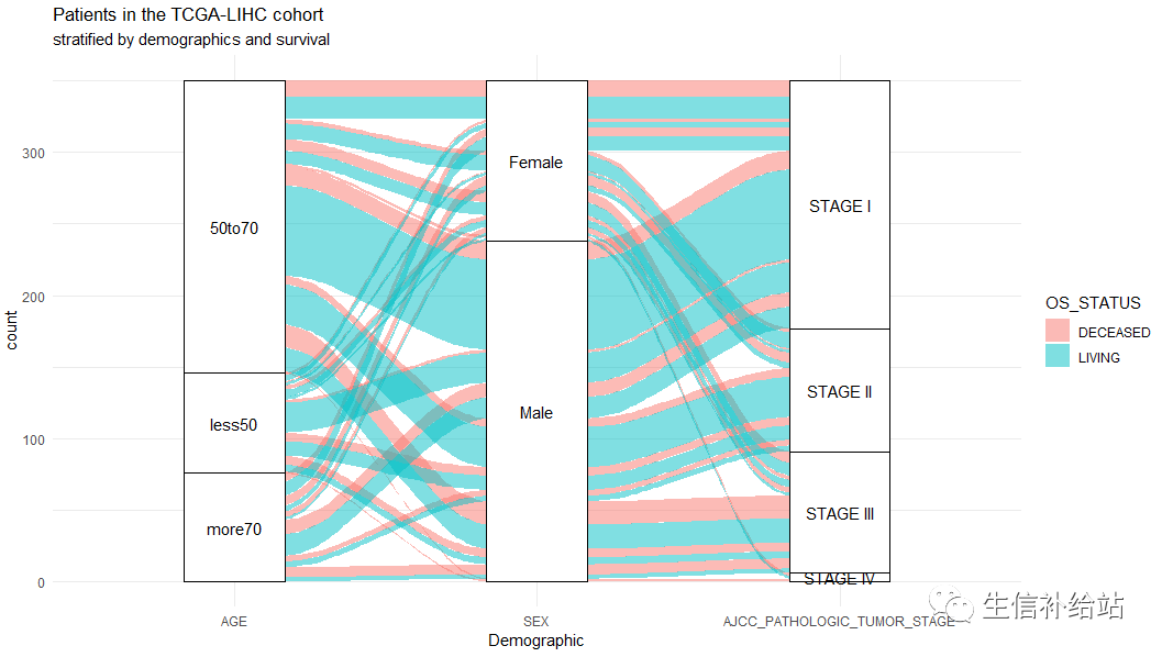 本文使用TCGA数据集中的LIHC的临床数据进行展示,大家可以根据数据格式处理自己的临床数据。也可后台回复“R-桑基图”获得示例数据以及R代码。