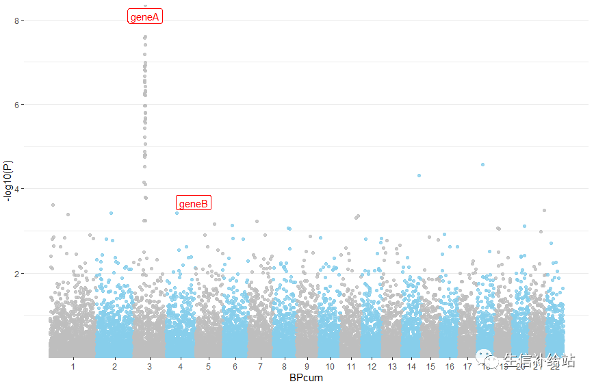 如果我们自己的gwas结果数据是Gene的话,label更改即可标示基因。