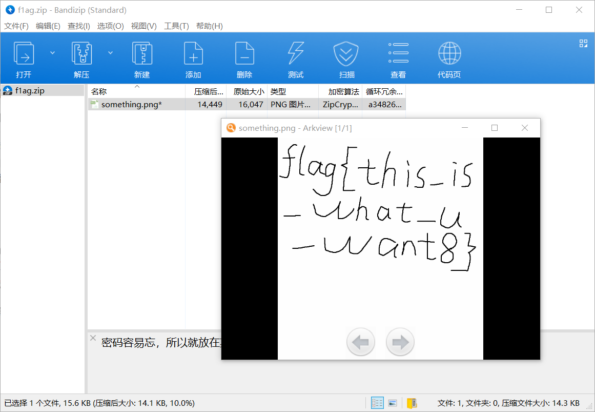 把五张图片都导出,在meiren.png中分离得到压缩包,其中有一个假的flag,但其实这张图里也套了个zip,再次分离,这次是加密的压缩包,给了hint:密码容易忘,所以就放在某个戴围脖的软件上了