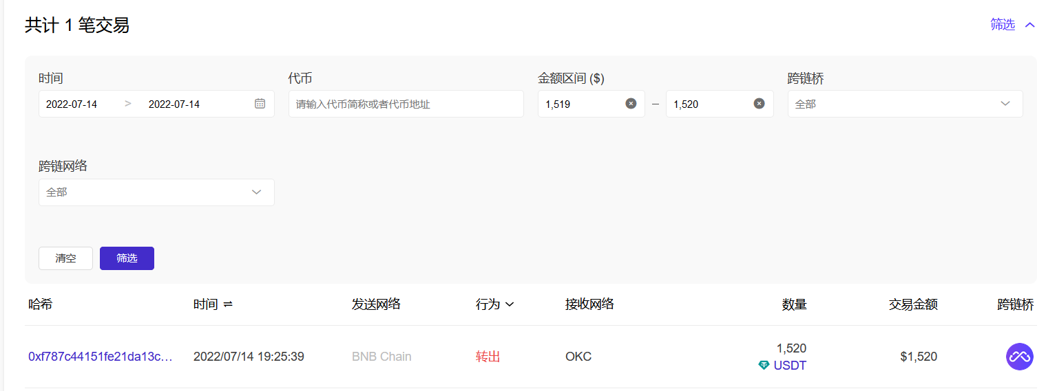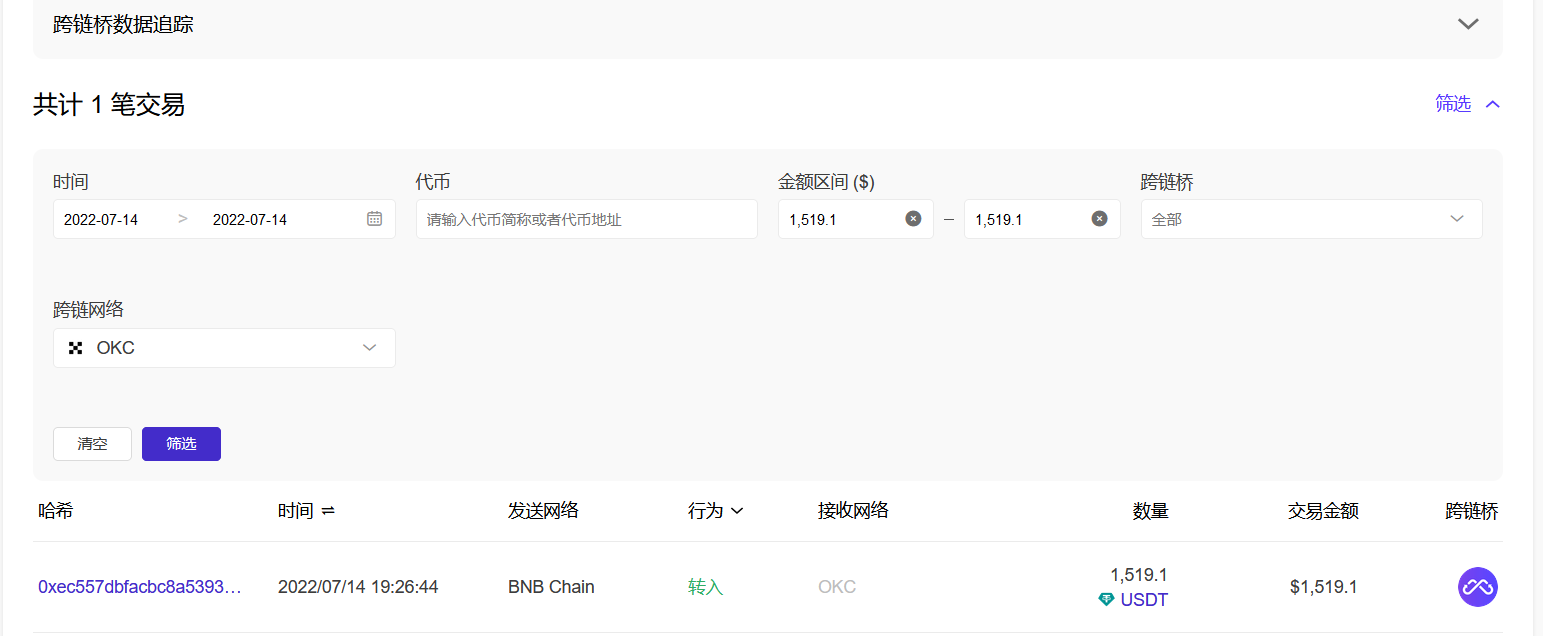 使用OKC链的跨链追踪 https://www.oklink.com/cn/okc/pro-defi-tracker?tab=bridge ,确定所需的记录