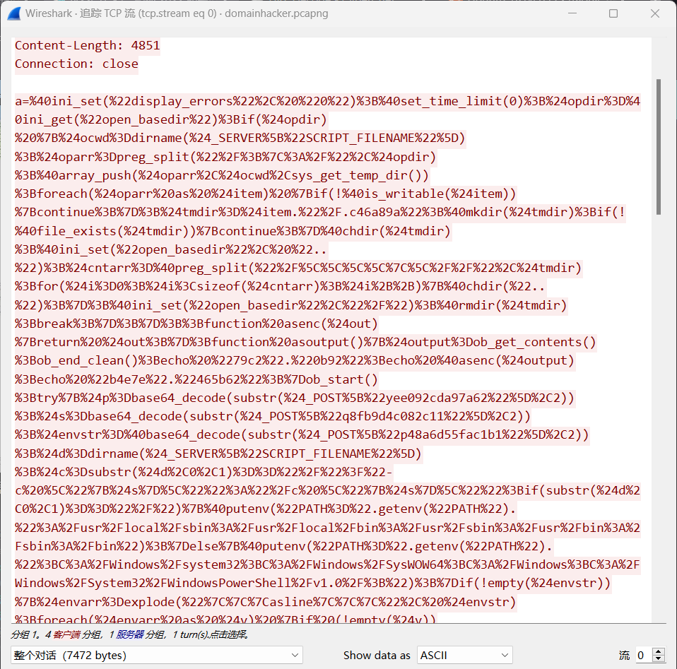 将蚁剑的正文内容进行URL解码后,流量最中明显的特征为@ini_set("display_errors","0");这段代码基本是所有WebShell客户端链接PHP类WebShell都有的一种代码,但是有的客户端会将这段编码或者加密,而蚁剑是明文,所以较好发现,同时蚁剑也有eval这种明显的特征。