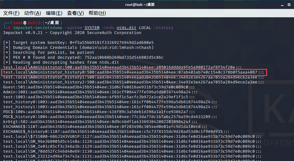使用Impacket工具包中的Secretsdump也可以解析Ntds.dit文件从而导出散列值