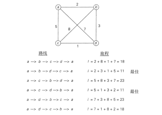 很容易看出来,哈密顿回路也可以定义为n+1个相邻顶点v1,v2,v3,…,vn,v1的一个序列。其中,序列的第一个顶点和最后一个顶点是相同的,而其它n-1个顶点都是互不相同的。并且,在不失一般性的前提下,可以假设,所有的回路都开始和结束于相同的特定顶点。因此,可以通过生成n-1个中间城市的组合来得到所有的旅行线路,计算这些线路的长度,然后求取最短的线路。下图是该问题的一个小规模实例,并用该方法得到了它的解,