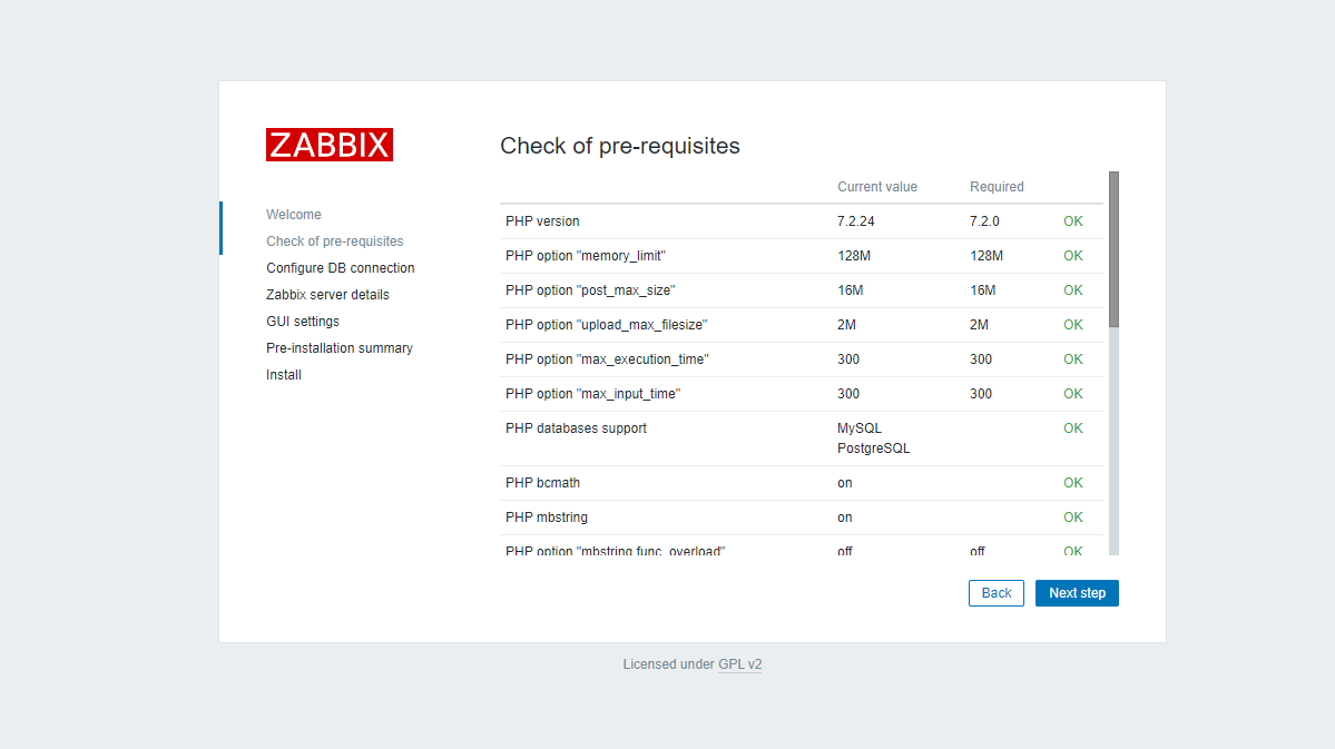 [root@localhost zabbix-4.0.3]# mkdir /usr/local/apache/htdocs/zabbix [root@localhost zabbix-5.2.6]# cp -r ui/* /usr/local/apache/htdocs/zabbix/ [root@localhost zabbix-5.2.6]# chown -R apache.apache /usr/local/apache/htdocs/ #配置虚拟主机 [root@localhost zabbix-5.2.6]# vim /etc/httpd24/extra/vhosts.conf [root@localhost zabbix-5.2.6]# cat /etc/httpd24/extra/vhosts.conf <VirtualHost *:80> DocumentRoot "/usr/local/apache/htdocs/zabbix" ServerName www.Mariko.com ProxyRequests Off ProxyPassMatch ^/(.*\.php)$ fcgi://127.0.0.1:9000/usr/local/apache/htdocs/zabbix/$1 <Directory "/usr/local/apache/htdocs/zabbix"> Options none AllowOverride none Require all granted </Directory> </VirtualHost> #重启服务 [root@localhost zabbix-5.2.6]# apachectl restart AH00558: httpd: Could not reliably determine the server's fully qualified domain name, using localhost.localdomain. Set the 'ServerName' directive globally to suppress this message [root@localhost zabbix-5.2.6]# ss -antl State Recv-Q Send-Q Local Address:Port Peer Address:Port LISTEN 0 128 0.0.0.0:22 0.0.0.0:* LISTEN 0 128 0.0.0.0:10050 0.0.0.0:* LISTEN 0 128 0.0.0.0:10051 0.0.0.0:* LISTEN 0 128 0.0.0.0:9000 0.0.0.0:* LISTEN 0 80 *:3306 *:* LISTEN 0 128 *:80 *:* LISTEN 0 128 [::]:22 [::]:*
