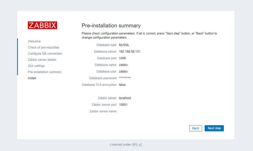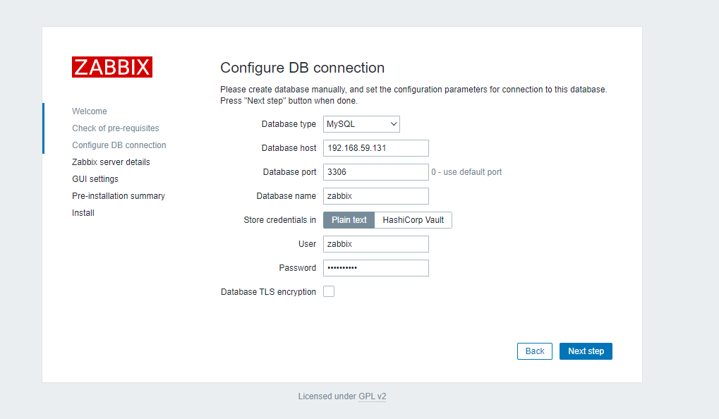 [root@localhost htdocs]# mysql -uroot -p<4564949a> -bash: syntax error near unexpected token `newline' [root@localhost htdocs]# mysql -uroot -p4564949a mysql: [Warning] Using a password on the command line interface can be insecure. Welcome to the MySQL monitor. Commands end with ; or \g. Your MySQL connection id is 111 Server version: 5.7.33 MySQL Community Server (GPL) Copyright (c) 2000, 2021, Oracle and/or its affiliates. Oracle is a registered trademark of Oracle Corporation and/or its affiliates. Other names may be trademarks of their respective owners. Type 'help;' or '\h' for help. Type '\c' to clear the current input statement. mysql> grant all on *.* to zabbix@'192.168.59.131' identified by '<4564949a>'; #本机ip Query OK, 0 rows affected, 1 warning (0.00 sec) mysql> flush privileges; Query OK, 0 rows affected (0.00 sec)