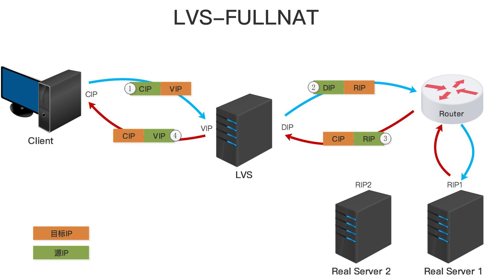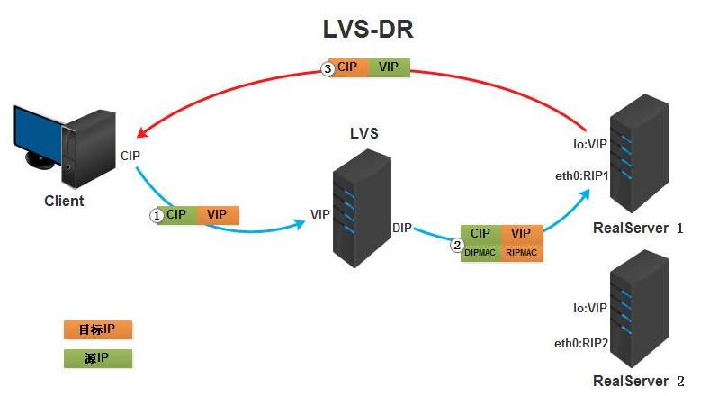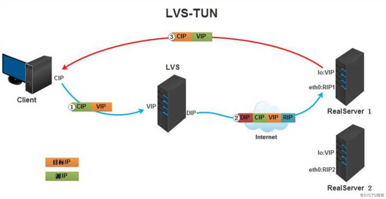 如上图:客户端将请求发送给VIP,报文首部为①,因为RIP是公网地址,而VIP是配置再lo网卡上,客户端从公网访问是找不到RS的VIP的,所以客户端发送的请求一定是发送到director,director收到请求后通过预设的算法来判断将请求转发给哪一台RS并且将报文首部再封装一层报文首部,此时报文首部修改成②,通过外面一层报文首部访问到RS,RS收到请求后,再解封装内层报文首部得知,是客户端通过CIP到director的VIP来访问的,于是通过lo网卡的VIP和客户端的CIP来封装报文首部,并且将资源返回给客户端,报文首部为③