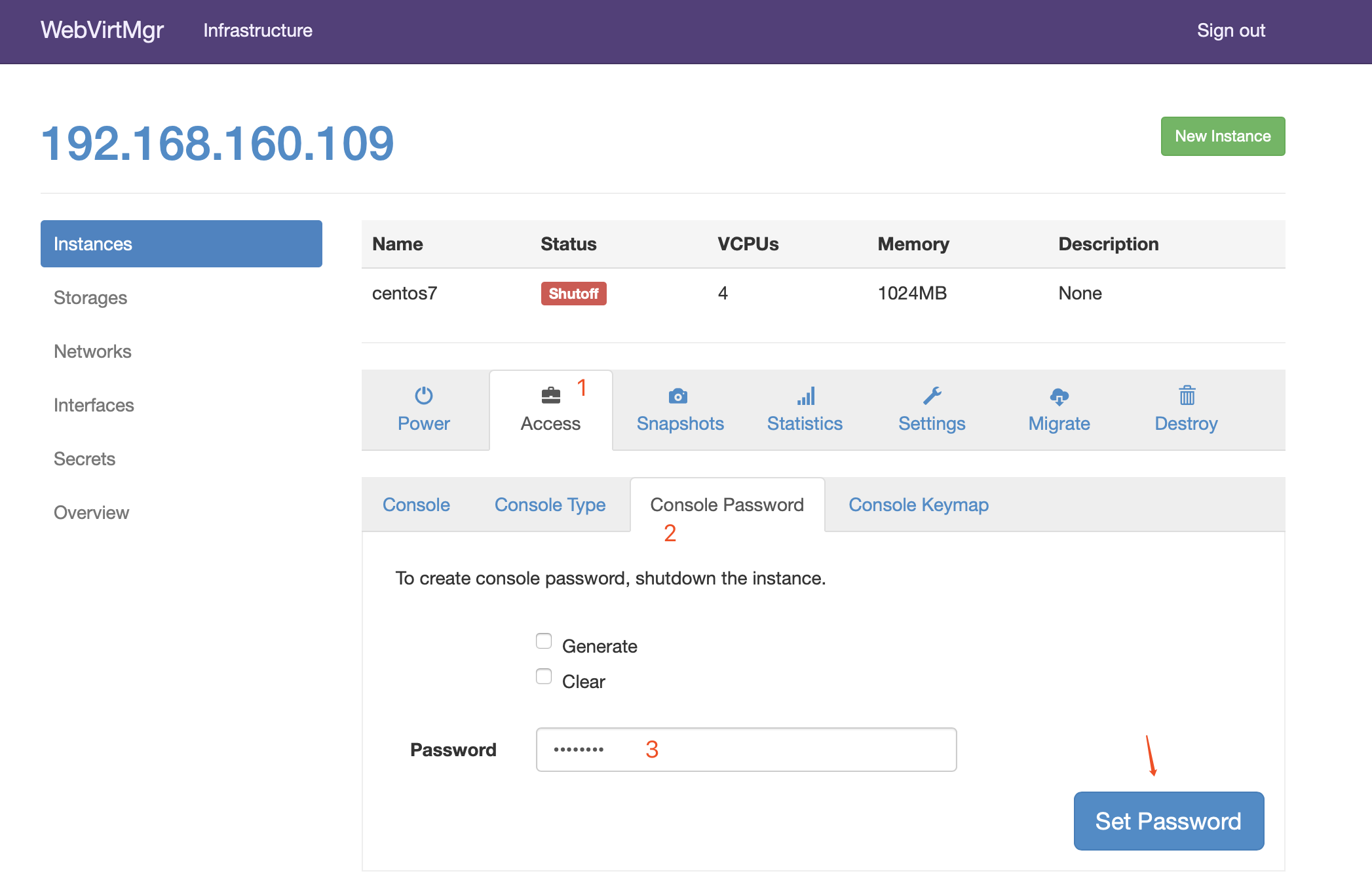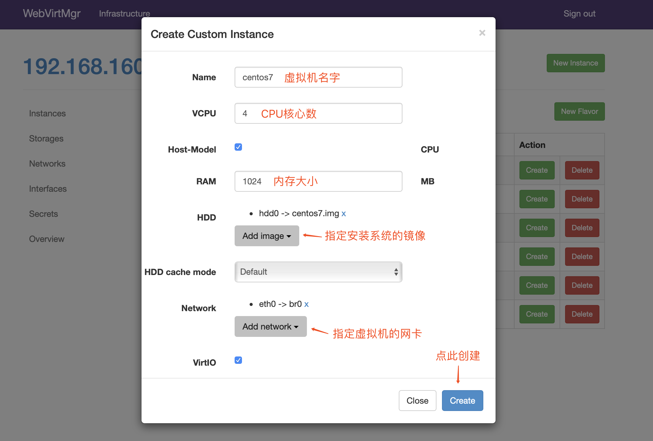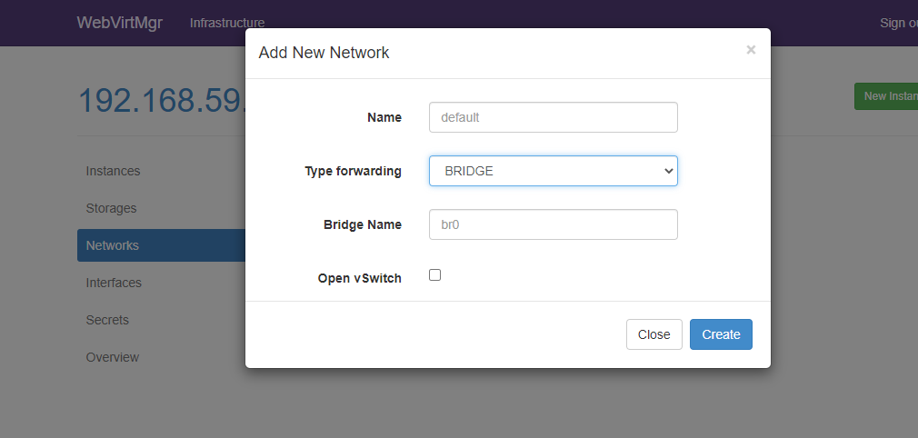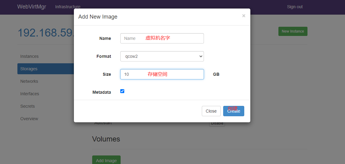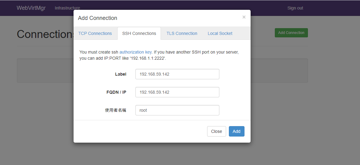 #安装依赖包 [root@143~]# yum -y install git python-pip libvirt-python libxml2-python python-websockify supervisor nginx python-devel #从github上下载webvirtmgr代码 [root@143 ~]# cd /usr/local/src/ [root@143 src]# git clone git://github.com/retspen/webvirtmgr.git Cloning into 'webvirtmgr'... #安装webvirtmgr [root@143 src]# cd webvirtmgr/ [root@143 webvirtmgr]# pip install -r requirements.txt #检查sqlite3是否安装 [root@143 webvirtmgr]# python Python 2.7.5 (default, Nov 16 2020, 22:23:17) [GCC 4.8.5 20150623 (Red Hat 4.8.5-44)] on linux2 Type "help", "copyright", "credits" or "license" for more information. >>> import sqlite3 >>> exit() #初始化账号 [root@143 webvirtmgr]# python manage.py syncdb WARNING:root:No local_settings file found. Creating tables ... Creating table auth_permission Creating table auth_group_permissions Creating table auth_group Creating table auth_user_groups Creating table auth_user_user_permissions Creating table auth_user Creating table django_content_type Creating table django_session Creating table django_site Creating table servers_compute Creating table instance_instance Creating table create_flavor You just installed Django's auth system, which means you don't have any superusers defined. Would you like to create one now? (yes/no): yes //问你是否创建超级管理员帐号 Username (leave blank to use 'root'): //指定超级管理员帐号用户名,默认留空为root Email address: 790650910@qq.com //设置超级管理员邮箱 Password: //设置超级管理员密码 Password (again): //再次输入超级管理员密码 Superuser created successfully. Installing custom SQL ... Installing indexes ... Installed 6 object(s) from 1 fixture(s) #拷贝网页到指定目录 [root@143 webvirtmgr]# cd .. [root@143 src]# mkdir -p /var/www [root@143 src]# cp -r webvirtmgr/ /var/www/ [root@143 src]# ll total 4 drwxr-xr-x 20 root root 4096 Jul 24 05:29 webvirtmgr [root@143 src]# chown -R nginx.nginx /var/www/webvirtmgr/ [root@143 src]# ll /var/www/ total 4 drwxr-xr-x 20 nginx nginx 4096 Jul 24 05:34 webvirtmgr #生成秘钥 [root@143 src]# ssh-keygen -t rsa Generating public/private rsa key pair. Enter file in which to save the key (/root/.ssh/id_rsa): Created directory '/root/.ssh'. Enter passphrase (empty for no passphrase): Enter same passphrase again: Your identification has been saved in /root/.ssh/id_rsa. Your public key has been saved in /root/.ssh/id_rsa.pub. The key fingerprint is: SHA256:NdHNeHbGYVEcS++sKTbRjctrFvRtNpurxf6xdHwpl1A root@143 The key's randomart image is: +---[RSA 2048]----+ | .. + O*| | .o B B| | o o E.| | . . .o= | | S .oo.=| | o+*B| | +.=%B| | . oO+=| | +o++| +----[SHA256]-----+ [root@143 src]# ssh-copy-id root@192.168.59.142 /usr/bin/ssh-copy-id: INFO: Source of key(s) to be installed: "/root/.ssh/id_rsa.pub" The authenticity of host '192.168.59.142 (192.168.59.142)' can't be established. ECDSA key fingerprint is SHA256:RmUyUj8k7idYXko0DM/lQzl4d7ycRPlbhGbFdd1zgvI. ECDSA key fingerprint is MD5:88:36:21:bf:3b:88:3e:ae:04:7e:df:47:1b:fd:6c:1d. Are you sure you want to continue connecting (yes/no)? yes /usr/bin/ssh-copy-id: INFO: attempting to log in with the new key(s), to filter out any that are already installed /usr/bin/ssh-copy-id: INFO: 1 key(s) remain to be installed -- if you are prompted now it is to install the new keys ^[[A root@192.168.59.142's password: Number of key(s) added: 1 Now try logging into the machine, with: "ssh 'root@192.168.59.142'" and check to make sure that only the key(s) you wanted were added. [root@143 src]# ssh root@192.168.59.142 'date' Sat Jul 24 05:40:04 EDT 2021