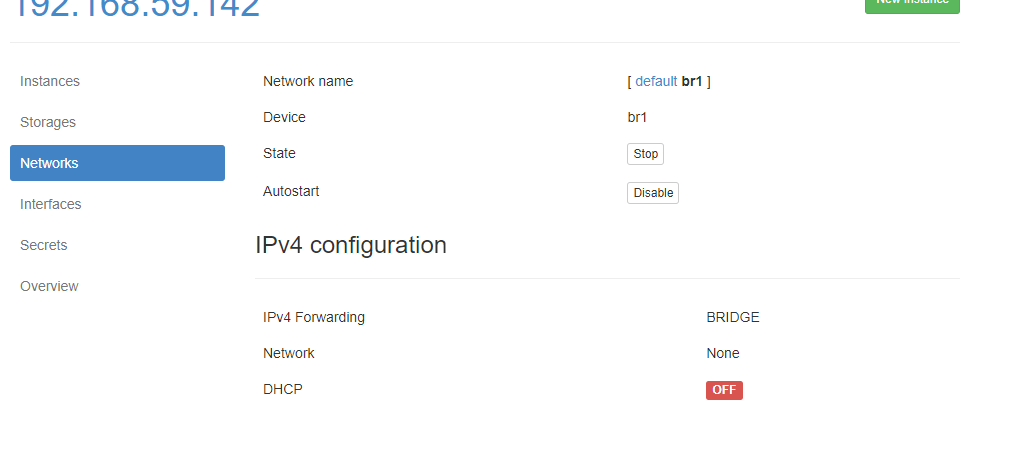 [root@142 network-scripts]# systemctl restart network [root@142 network-scripts]# ip a 1: lo: <LOOPBACK,UP,LOWER_UP> mtu 65536 qdisc noqueue state UNKNOWN group default qlen 1000 link/loopback 00:00:00:00:00:00 brd 00:00:00:00:00:00 inet 127.0.0.1/8 scope host lo valid_lft forever preferred_lft forever inet6 ::1/128 scope host valid_lft forever preferred_lft forever 2: ens33: <BROADCAST,MULTICAST,UP,LOWER_UP> mtu 1500 qdisc pfifo_fast master br0 state UP group default qlen 1000 link/ether 00:0c:29:56:9e:d8 brd ff:ff:ff:ff:ff:ff inet6 fe80::20c:29ff:fe56:9ed8/64 scope link valid_lft forever preferred_lft forever 3: br0: <BROADCAST,MULTICAST,UP,LOWER_UP> mtu 1500 qdisc noqueue state UP group default qlen 1000 link/ether 00:0c:29:56:9e:d8 brd ff:ff:ff:ff:ff:ff inet 192.168.59.142/24 brd 192.168.59.255 scope global br0 valid_lft forever preferred_lft forever inet6 fe80::20c:29ff:fe56:9ed8/64 scope link valid_lft forever preferred_lft forever 4: virbr0: <NO-CARRIER,BROADCAST,MULTICAST,UP> mtu 1500 qdisc noqueue state DOWN group default qlen 1000 link/ether 52:54:00:78:c6:02 brd ff:ff:ff:ff:ff:ff inet 192.168.122.1/24 brd 192.168.122.255 scope global virbr0 valid_lft forever preferred_lft forever 5: virbr0-nic: <BROADCAST,MULTICAST> mtu 1500 qdisc pfifo_fast master virbr0 state DOWN group default qlen 1000 link/ether 52:54:00:78:c6:02 brd ff:ff:ff:ff:ff:ff