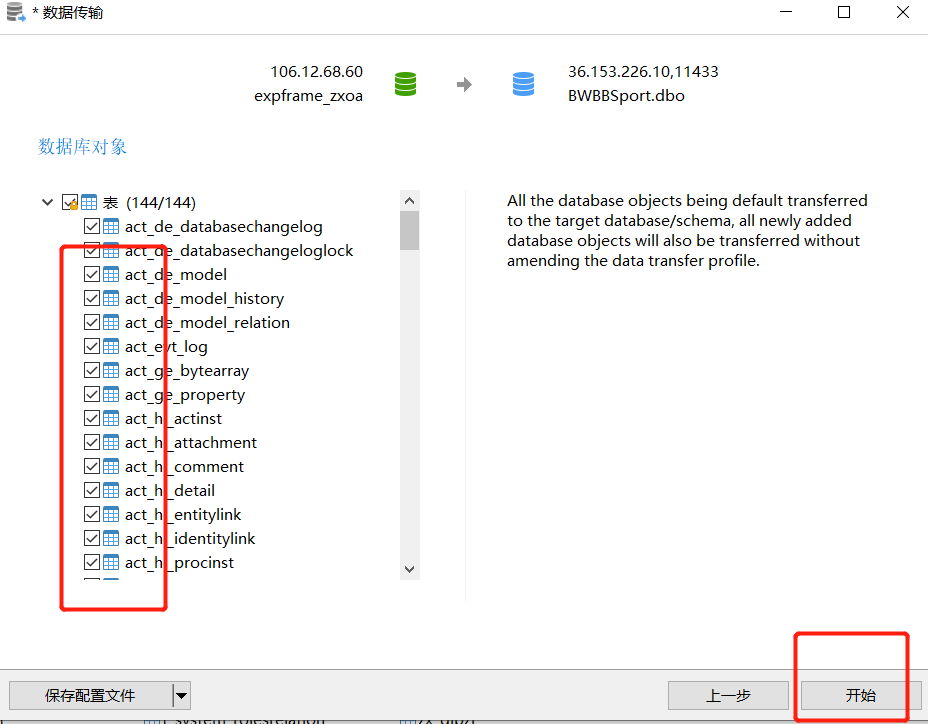 选中需要传输的表,点击开始