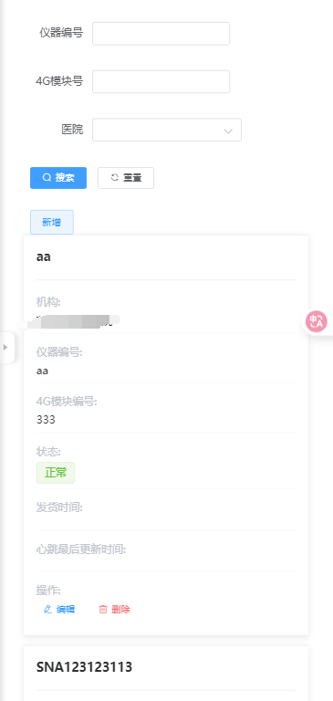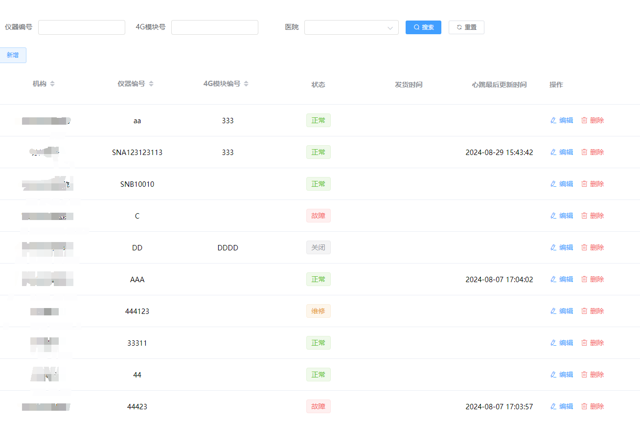 <flex-table :data="dataList" style="width: 100%" v-loading="loading" primary-field="number"> <el-table-column prop="organization" label="机构" sortable align="center"></el-table-column> <el-table-column prop="number" label="仪器编号" sortable align="center"></el-table-column> <el-table-column prop="sn4g" label="4G模块编号" sortable align="center"></el-table-column> <el-table-column prop="state" label="状态" align="center"> <template slot-scope="scope"> <el-tag-mid v-if="scope.row.state==0" type="success""> 正常 </el-tag-mid> <el-tag-mid v-else-if=" scope.row.state==1" type="danger"> 故障 </el-tag-mid> <el-tag-mid v-else-if="scope.row.state==2" type="info"> 关闭 </el-tag-mid> <el-tag-mid v-else-if="scope.row.state==3" type="warning"> 维修 </el-tag-mid> </template> </el-table-column> <el-table-column prop="deliver_date" label="发货时间" align="center"> </el-table-column> <el-table-column prop="socketHeartLastTime" label="心跳最后更新时间" align="center"> </el-table-column> <el-table-column label="操作" width="240" type="action" > <template slot-scope="scope"> <el-button type="text" icon="el-icon-edit" @click="editInfo(scope.row)">编辑</el-button> <el-button type="text" icon="el-icon-delete" @click="handelDelete(scope.row.id)" style="color:#F56C6C">删除</el-button> </template> </el-table-column> </flex-table>
