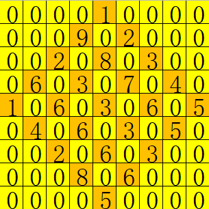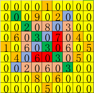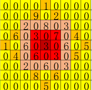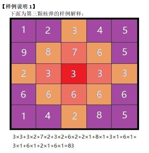 图中每一个格点的值是这个点的价值, 这个核弹的当量是\(3\), 爆炸中心是\((3,3)\).