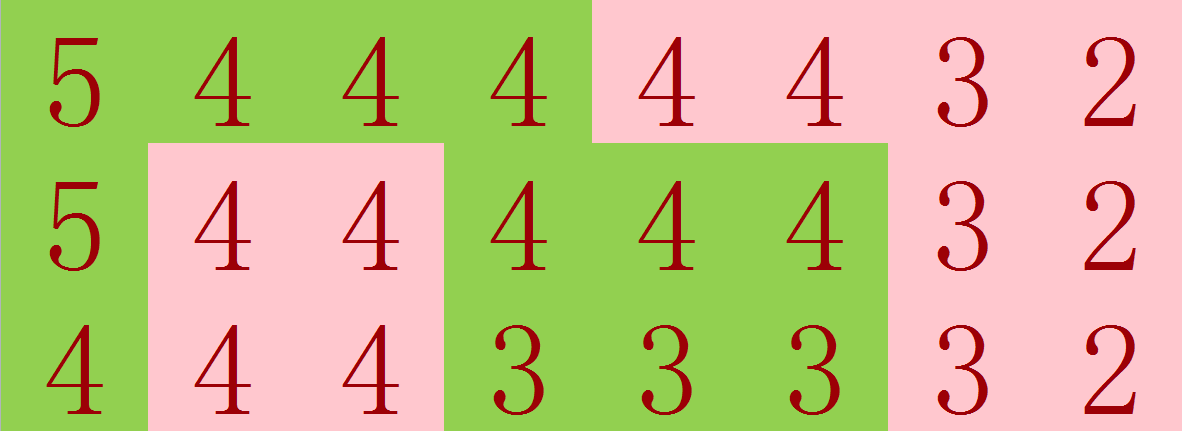 如何解决这个问题呢? 实际上我们需要有分析数据特征的思想. 一般来说, 区间修改, 并且要维护单调性, 这是很难实现的(如图1, 绿色的是要修改的部分). 但是我们每一次只减\(1\), 并且修改范围是从\(1\)开始的一个连续的区间, 就可以靠这个搞点大事情.