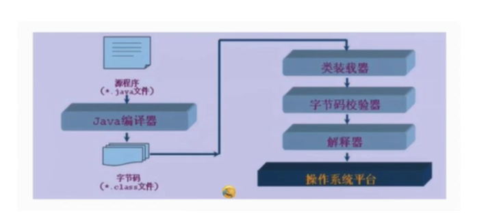 源文件经过javac进行编译,然后通过类装载器装载进运行环境,然后通过字节码校验不报错,通过解释器反馈到操作平台。