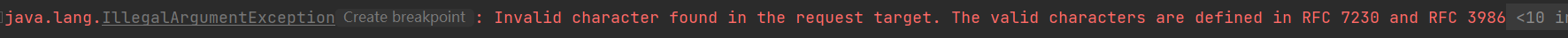 java.lang.IllegalArgumentException: Invalid character found in the request target. The valid characters are defined in RFC 7230 and RFC 3986 at org.apache.coyote.http11.AbstractNioInputBuffer.parseRequestLine(AbstractNioInputBuffer.java:283) at org.apache.coyote.http11.AbstractHttp11Processor.process(AbstractHttp11Processor.java:1017) at org.apache.coyote.AbstractProtocol$AbstractConnectionHandler.process(AbstractProtocol.java:684) at org.apache.tomcat.util.net.NioEndpoint$SocketProcessor.doRun(NioEndpoint.java:1520) at org.apache.tomcat.util.net.NioEndpoint$SocketProcessor.run(NioEndpoint.java:1476) at java.util.concurrent.ThreadPoolExecutor.runWorker(ThreadPoolExecutor.java:1142) at java.util.concurrent.ThreadPoolExecutor$Worker.run(ThreadPoolExecutor.java:617) at org.apache.tomcat.util.threads.TaskThread$WrappingRunnable.run(TaskThread.java:61) at java.lang.Thread.run(Thread.java:745)