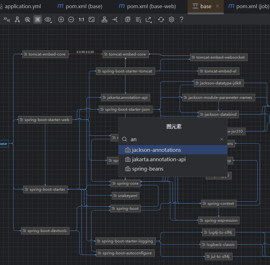 如果项目存在多个模块,当我们在项目根目录下的pom.xml中寻找不到所需的依赖时,我们可以使用maven依赖树。