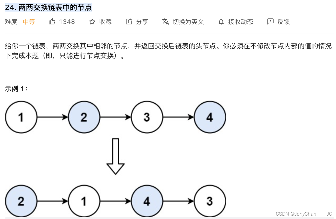 算法思想:要交换就要指向需要交换的 2 个node,还需要 tmp 指针标记下一个 node