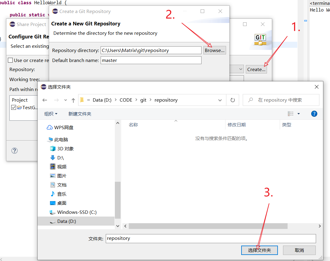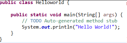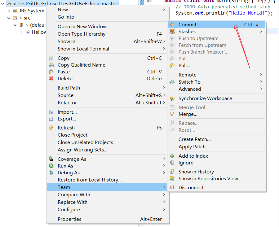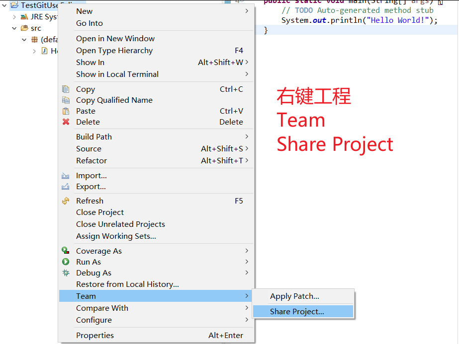 为演示,新建一个工程文件TestGitUseEclipse,在src目录下新建HelloWorld的一个.java文件,在此类中调用main函数打印"Hello World!"字样。