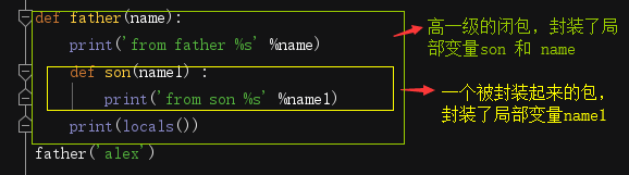 def father(name): print('from father %s' %name) def son() : #这里的son 为局部变量,函数外部无法单独调用 print('from father %s' %name) print(locals()) father('alex')