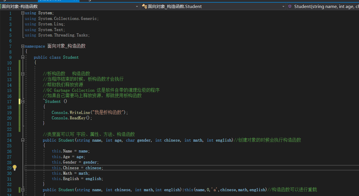 //析构函数 构造函数 //当程序结束的时候,析构函数才会执行 //帮助我们释放资源 //GC Garbage Collection 这是软件自带的清理垃圾的程序 //如果自己需要马上释放资源,那就使用析构函数