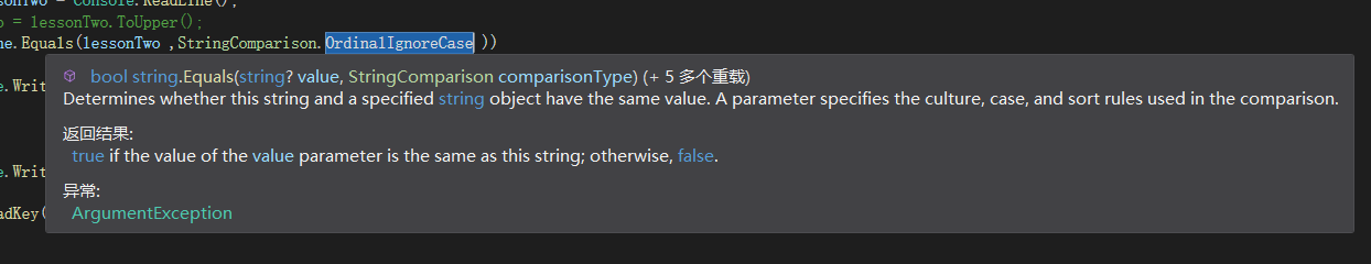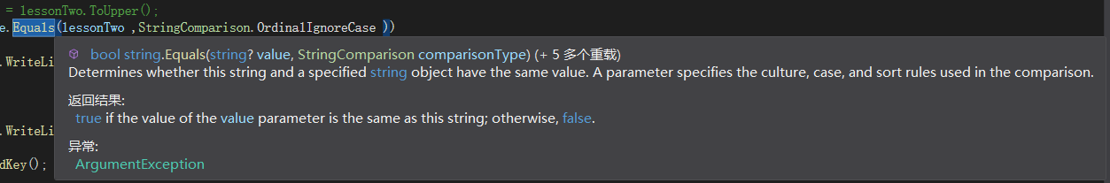 4)Equals(lessonTwo ,StringComparison.OrdinalIgnoreCase ):比较两个字符串,可以忽略大小写