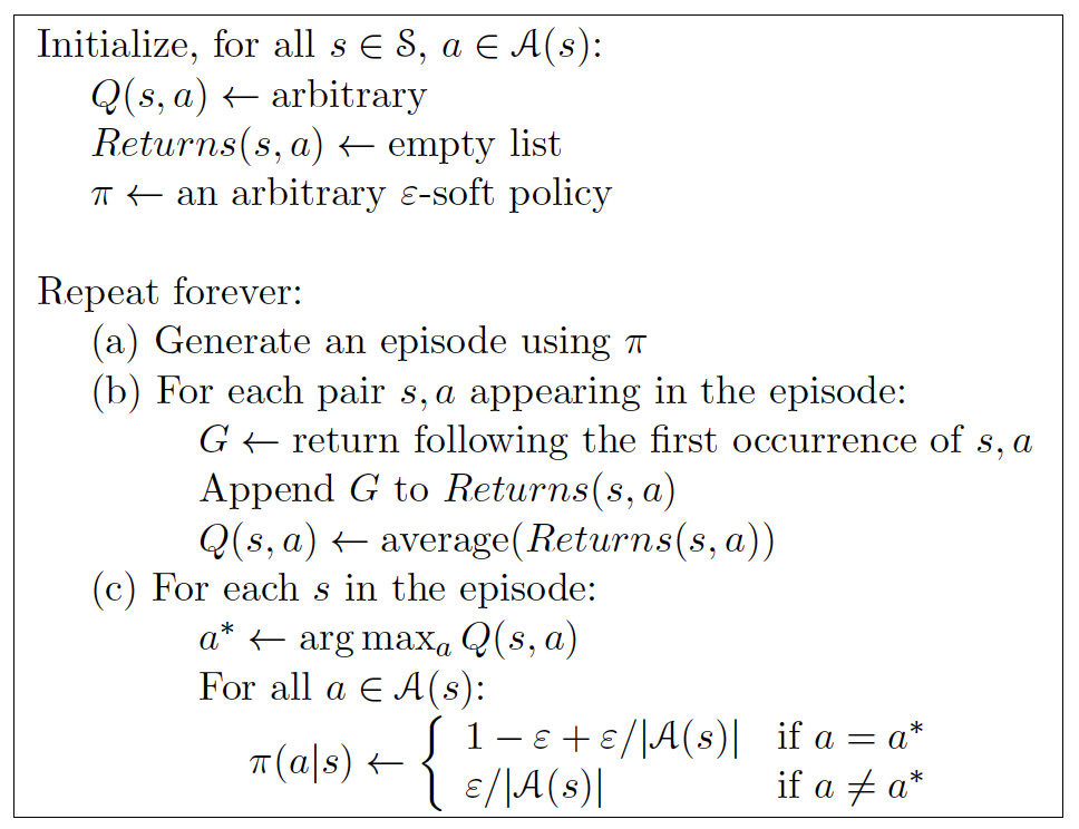 为了保证策略迭代对于所有行为值有效,我们必须保证持续的探索。一种解决的方法是在状态序列开始时,每个状态行为对被选到的概率都不为 0,这种方法称为探索初值假定(exploring starts)。
