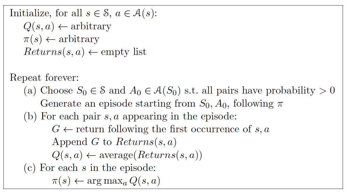 下面给出 Monte Carlo with Exploring Starts 算法流程: