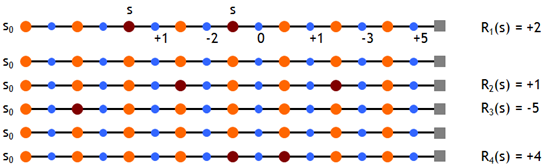 现在有个问题是:状态 \(s\) 可能在一个 episode 中出现不止一次,从下图中就可以看出来。图中每一行都是当前策略下的一个独立的 episode.
