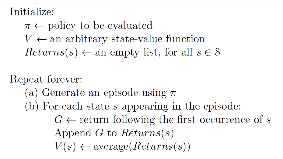 很明显生成的 episode 越多,对状态值函数 \({v_\pi }\left( s \right)\) 的估计就越准确,具体的算法流程为\([2]\):