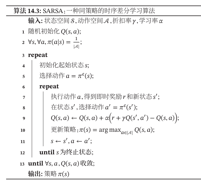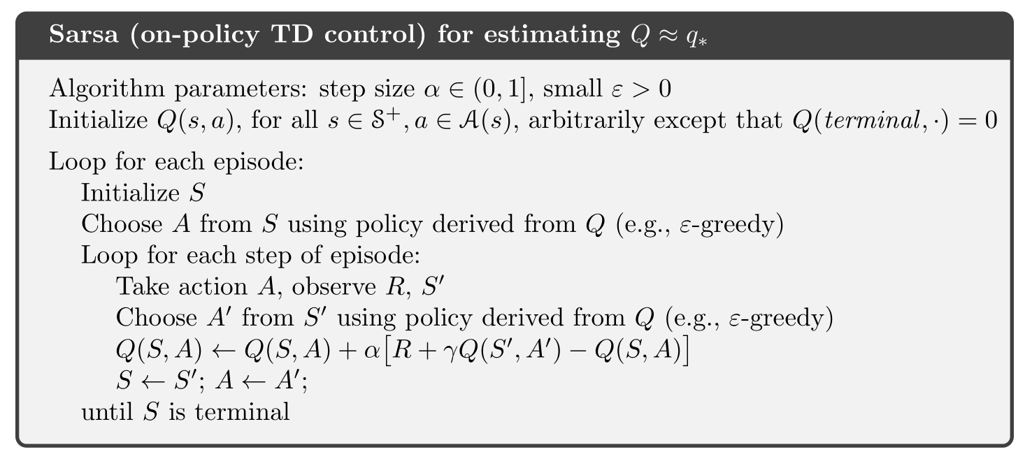 可以看一下 \(Sutton\) 书上的伪代码,意思是一样的,不过要注意的是在根据下一步状态 \(s^{\prime}\) 选下一步动作 \(a ^{\prime}\) 时是 \(\varepsilon-greedy\) 的。