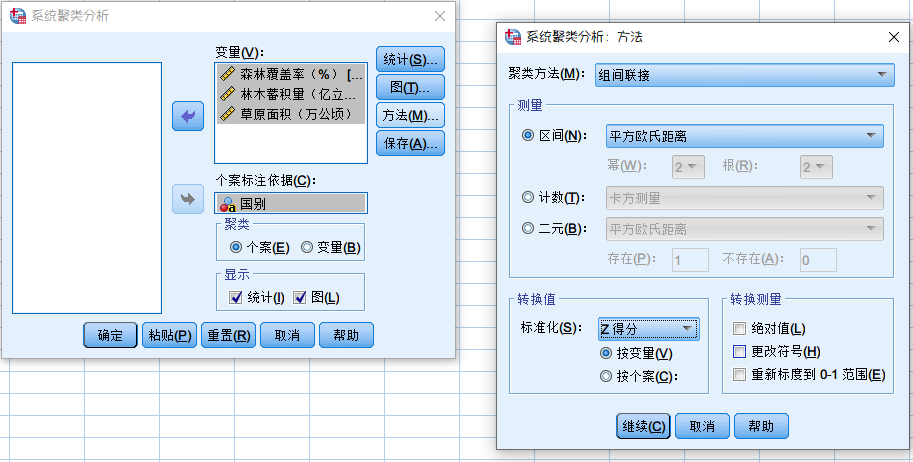 为了研究世界各国森林、草原资源的分布规律,共抽取了21个国家的数据,每个国家3项指标,见下表1。请进行聚类分析。