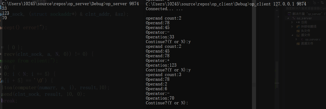 #include <stdio.h> #include <stdlib.h> #include <WinSock2.h> #define N 1024 #pragma warning(disable:4996) #pragma comment(lib,"ws2_32.lib") void ErrorHandling(const char* message); int main(int argc, char* argv[]) { WSADATA wsaData; SOCKET serv_sock; SOCKADDR_IN serv_addr; int i; if(argc != 3) { printf("Usage: %s <IP> <port>\n", argv[0]); system("PAUSE"); exit(1); } if (WSAStartup(MAKEWORD(2, 2), &wsaData) != 0) ErrorHandling("WSAStarup error!"); serv_sock = socket(PF_INET, SOCK_STREAM, 0); if (serv_sock == INVALID_SOCKET) ErrorHandling("socket() error!"); memset(&serv_addr, 0, sizeof(serv_addr)); serv_addr.sin_family = AF_INET; serv_addr.sin_addr.s_addr = inet_addr(argv[1]); serv_addr.sin_port = htons(atoi(argv[2])); if (connect(serv_sock, (struct sockaddr*) & serv_addr, sizeof(serv_addr)) == SOCKET_ERROR) ErrorHandling("connect() error"); else puts("Connected... ...\n"); while (1) { char a[N] = { 0 }, s[10] = { 0 }, result[10] = { 0 }; int op_count = 0; fputs("operand count:", stdout); scanf("%d", &op_count); for (i = 0; i < op_count; ++i) { fputs("Operand:", stdout); scanf("%s", &a[i*5]); } fputs("Operator:", stdout); scanf("%s", &a[op_count*5]); if (send(serv_sock, a, N, 0) == -1) ErrorHandling("send() error!"); int flag = recv(serv_sock, result, 10, 0); if ( flag == -1 ) ErrorHandling("recv() error!"); if (flag != 0) { printf("Operation:%s\n", result); Sleep(1000); } fputs("Continue?(Y or N):", stdout); scanf("%s", s); if (!strcmp(s,"n") || !strcmp(s, "N")) break; memset(a, 0, N); } closesocket(serv_sock); system("PAUSE"); return 0; } void ErrorHandling(const char* message) { fputs(message, stderr); fputc('\n', stderr); system("PAUSE"); exit(1); }