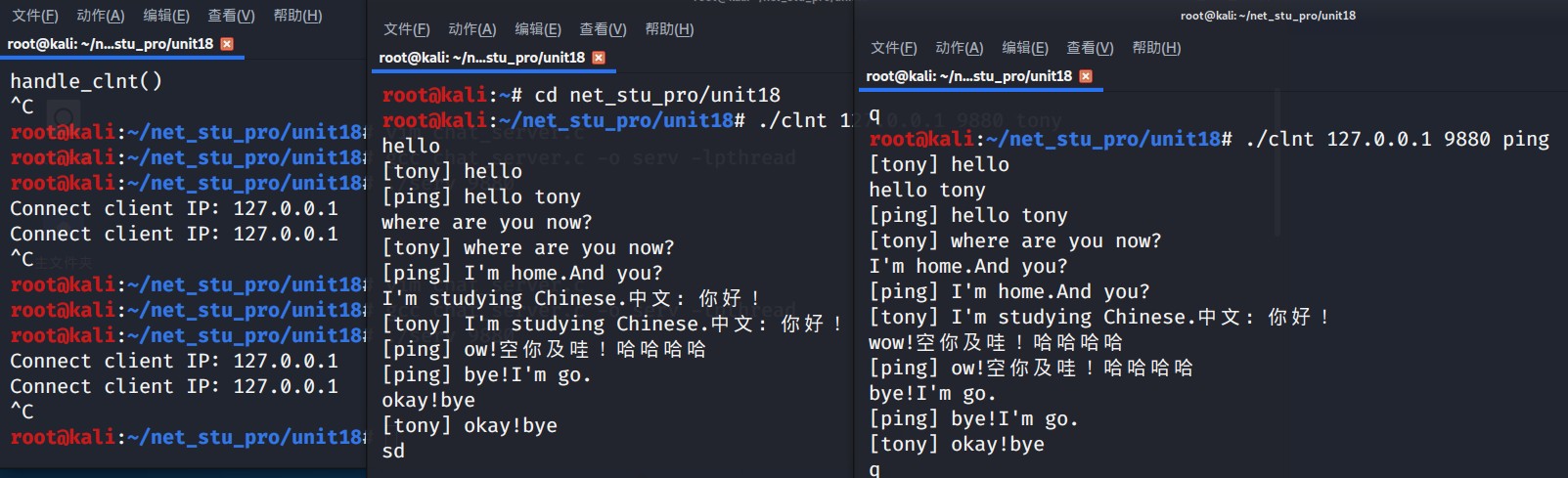 #include <stdio.h> #include <stdlib.h> #include <process.h> #include <Windows.h> #include <string.h> #pragma warning(disable:4996) #pragma comment(lib, "ws2_32.lib") #define BUF_SZ 100 #define NAME_SZ 20 void ErrorHandling(const char* msg); unsigned WINAPI SendMsg(void* arg); unsigned WINAPI RecvMsg(void* arg); char name[NAME_SZ] = "[DEFAULT]"; char msg[BUF_SZ] = ""; int main(int argc, char* argv[]) { WSADATA wsaData; SOCKET hSock; SOCKADDR_IN servAdr; HANDLE hSndThread, hRcvThread; if (argc != 4) { printf("Usage: %s <IP> <port> <name>\n", argv[0]); system("PAUSE"); exit(-1); } if (WSAStartup(MAKEWORD(2, 2), &wsaData) != 0) ErrorHandling("WSAStartup() error"); // 初始化用户名 sprintf(name, "[%s]", argv[3]); // 初始化结构体 if ((hSock = socket(PF_INET, SOCK_STREAM, 0)) == INVALID_SOCKET) ErrorHandling("socket() error"); memset(&servAdr, 0, sizeof(servAdr)); servAdr.sin_family = AF_INET; servAdr.sin_addr.s_addr = inet_addr(argv[1]); servAdr.sin_port = htons(atoi(argv[2])); if (connect(hSock, (struct sockaddr*)&servAdr, sizeof(servAdr)) == SOCKET_ERROR) ErrorHandling("connect() error"); // 创建线程 hSndThread = (HANDLE)_beginthreadex(NULL, 0, SendMsg, (void*)&hSock, 0, NULL); hRcvThread = (HANDLE)_beginthreadex(NULL, 0, RecvMsg, (void*)&hSock, 0, NULL); // 检测线程信号量 WaitForSingleObject(hSndThread, INFINITE); WaitForSingleObject(hRcvThread, INFINITE); closesocket(hSock); WSACleanup(); system("PAUSE"); return 0; } void ErrorHandling(const char* msg) { fputs(msg, stderr); fputc('\n', stderr); system("PAUSE"); exit(-1); } unsigned __stdcall SendMsg(void* arg) { SOCKET hSock = *((SOCKET*)arg); char namemsg[BUF_SZ + NAME_SZ] = { 0 }; while (1) { fgets(msg, BUF_SZ, stdin); if (!strcmp(msg, "q\n") || !strcmp(msg, "Q\n")) { closesocket(hSock); exit(0); } sprintf(namemsg, "%s %s", name, msg); send(hSock, namemsg, strlen(namemsg), 0); } return 5; } unsigned __stdcall RecvMsg(void* arg) { SOCKET hSock = *((SOCKET*)arg); int strLen = 0; char namemsg[BUF_SZ + NAME_SZ] = { 0 }; while (1) { if ((strLen = recv(hSock, namemsg, NAME_SZ + BUF_SZ + 1, 0)) == -1) exit(-1); namemsg[strLen] = '\0'; fputs(namemsg, stdout); } return 6; }