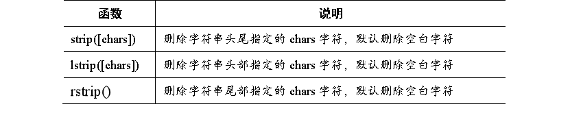 在处理字符串时,有时需要删除字符串头尾的某些字符,这时可以使用strip()、lstrip()和rstrip()函数,如表所示。