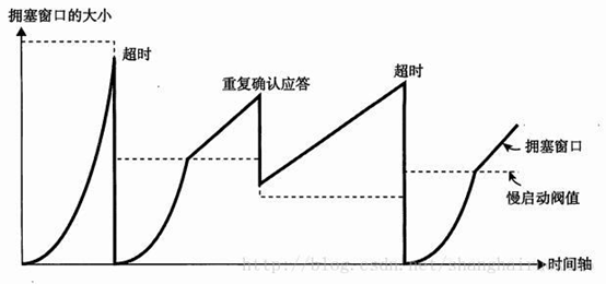 下图为拥塞控制过程中,拥塞窗口的大小变化图。有了拥塞窗口后,实际窗口的大小为拥塞窗口和ACK包中传递的窗口大小两个中的最小值。